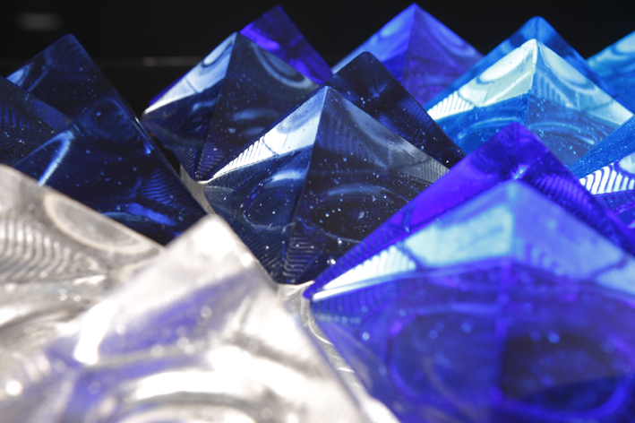 Inspired by a pair of cut glass decanters in the collection of Broadfield House Glass Museum, Deep Blue was created for an exhibition held at the Museum during the International Festival of Glass 2012. It was purchased for their collection in early 2013. Images are a mix of the piece in situ, and studio shots of the glass components.